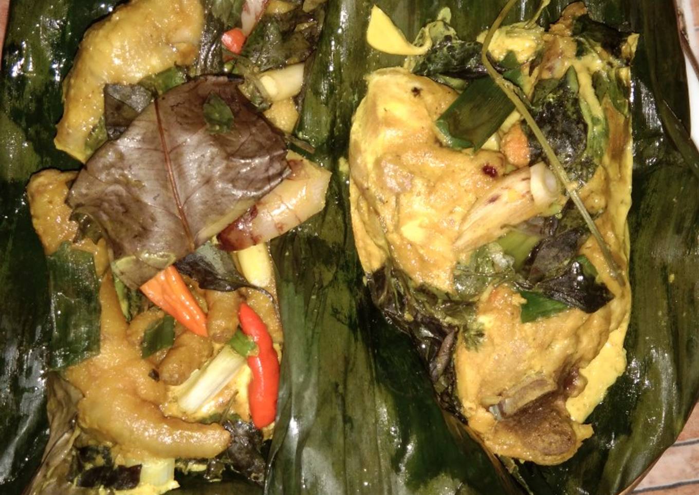 - Amparkan daun pisang, simpan potongan ayam dan ceket diatas daun kemudian bagian atasnya taburi dgn daun kemangi dan bumbu iris,,, lipat daun dan kukus hingga matang