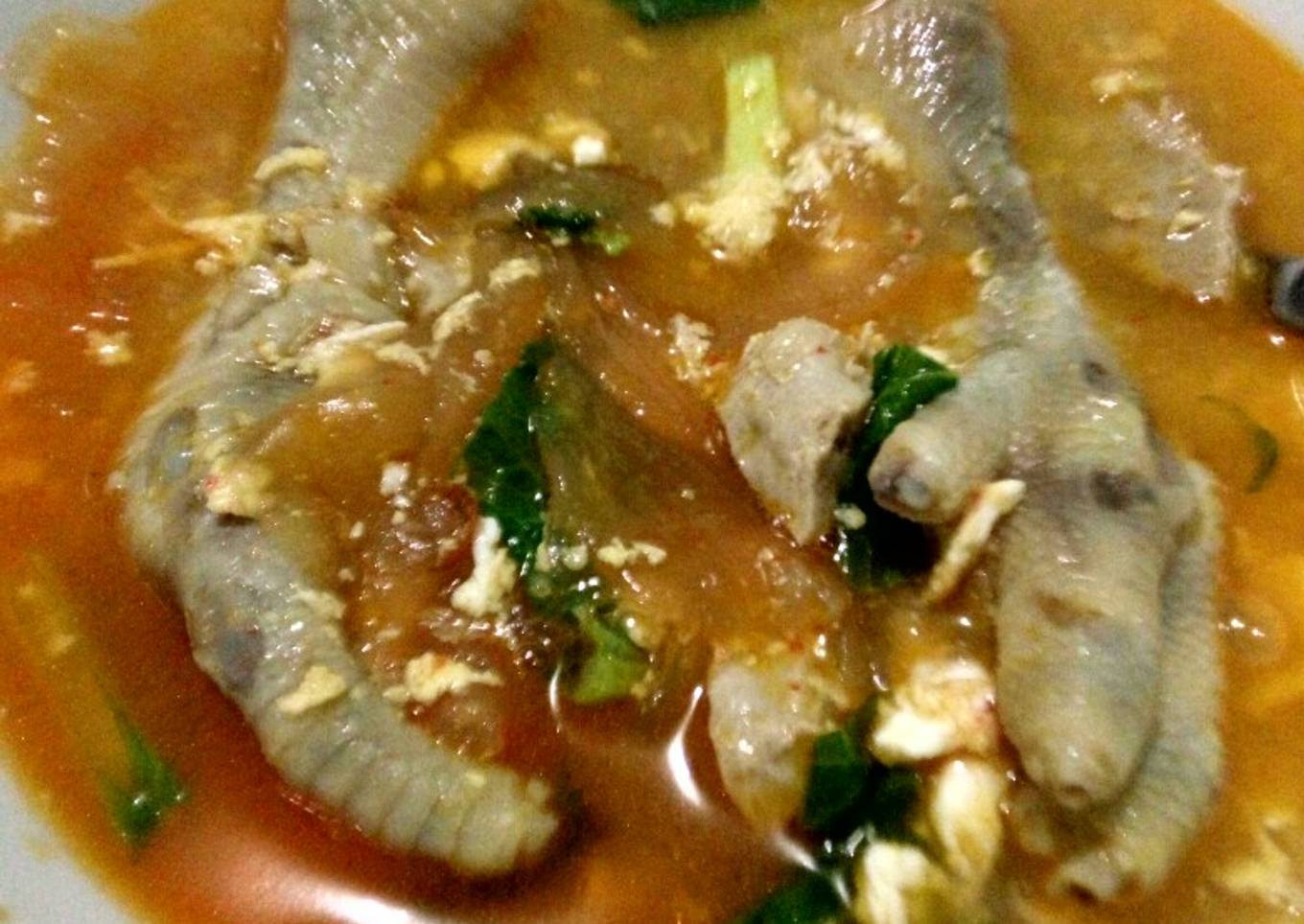 - Kalau sdh mendidih masukin ceker,masak sampai empuk. Oiya sblm'a si ceker sdh sy rebus terlebih dahulu ya. Klw sdh empuk br masukin kerupuk dan sawi hijau,beri garam dan kaldu sesuai selera yg diinginkan.