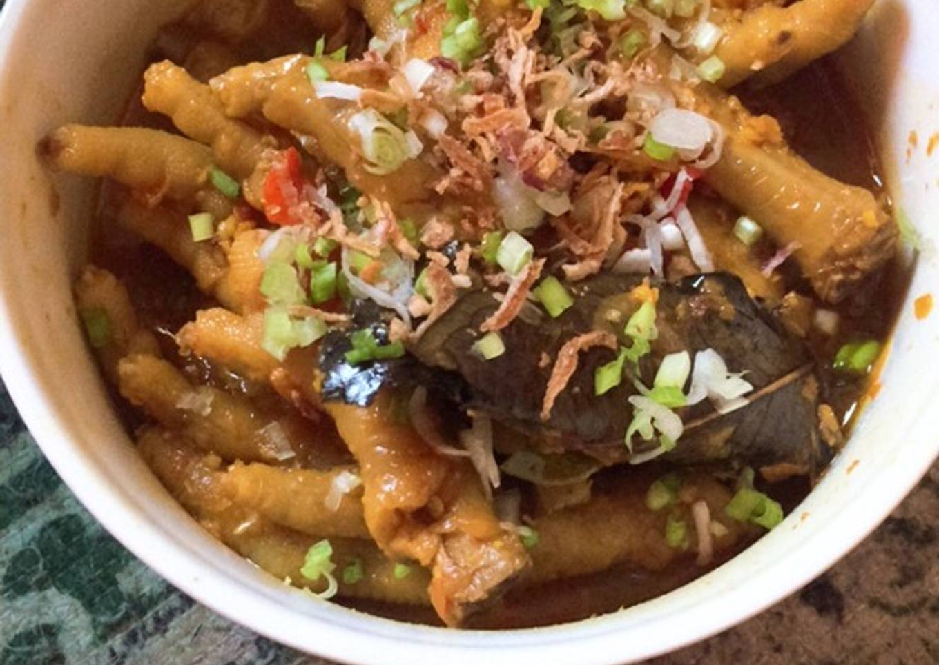 - Masukkan air kaldu sedikit sambil masukkan ceker rebus sampai air surut masukkan garam dan gula serta kecap manis koreksi rasa.