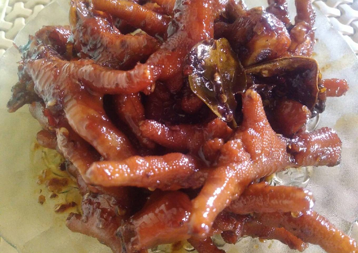 - Semua bumbu dihaluskan kemudian tumis sampai harum lalu kasih air sedikit dan masukan ceker yg sdh direbus bersama daun salam n daun jeruk td,yg terakhir ksh sebks kecap manis dan bumbuin dgn garam,gula,penyedap lalu biarkan sampai bnr' bumbu meresap dan empuk cekernya