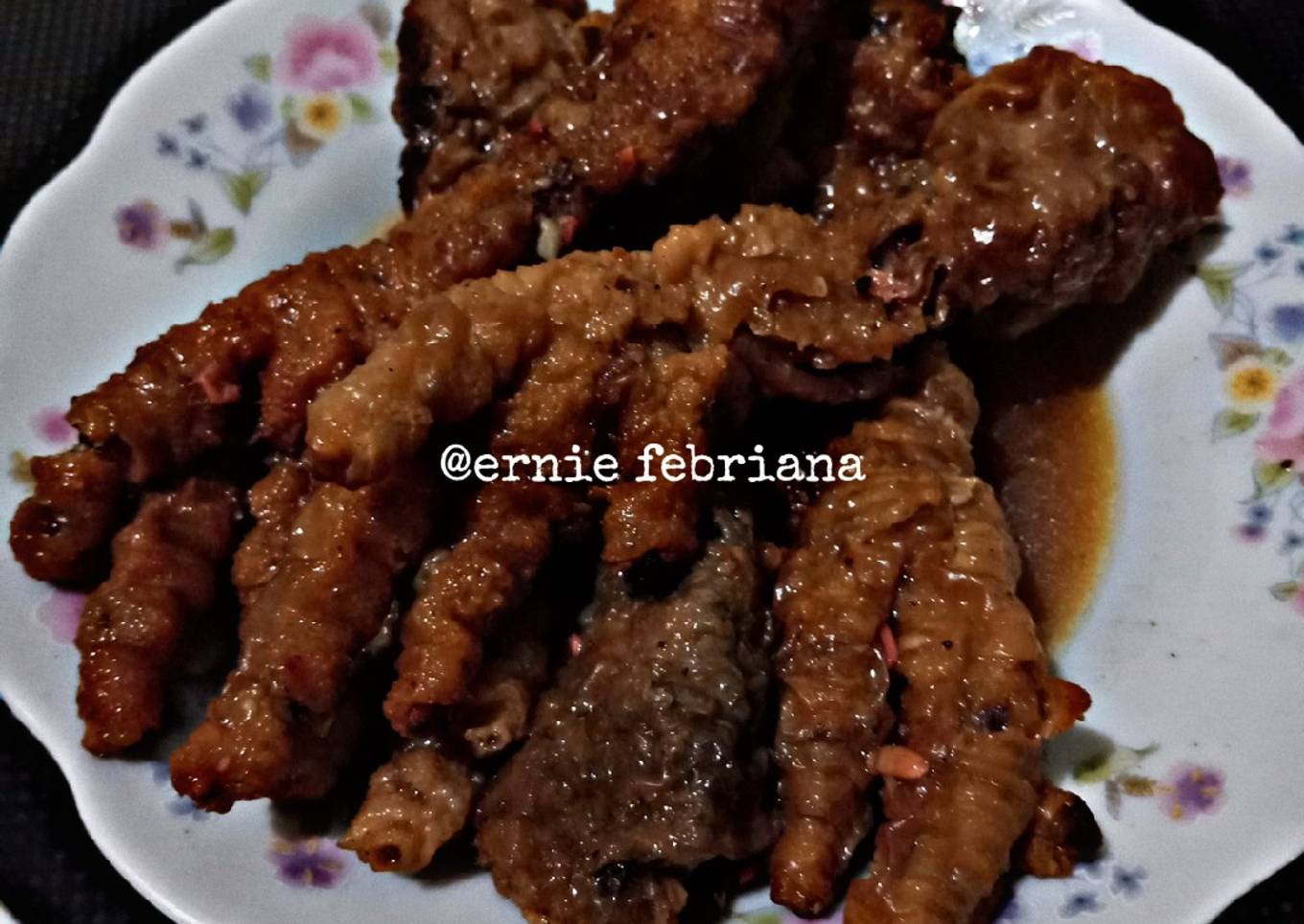 - Masukkan ceker aduk rata tambahkan bumbu ngohiong, kecap manis, garam, lada dan kaldu jamur, aduk rata