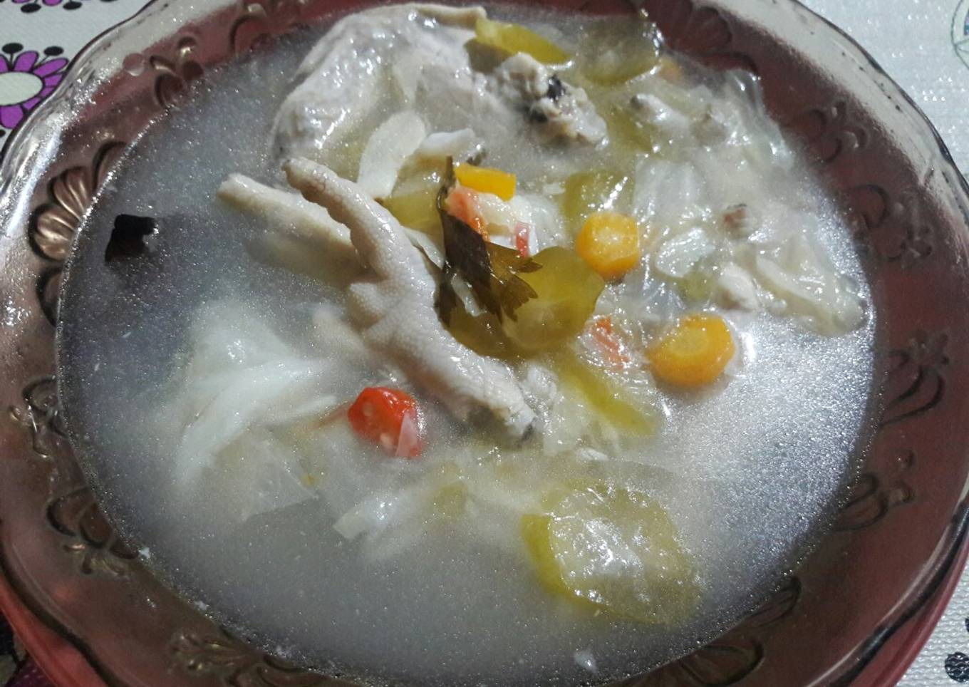 - Rebus ceker dan sayap, jika sudah mendidih buang air pertamnya lalu tambahkan dengan air panas. Masak lagi sampai mendidih. Masukan semua bahan irisan kecuali kol dan wortel plus tambahkan garam. Tunggu sampai mendidih, tambahkan wortel. Jika wortel sudah empuk masukan kol.