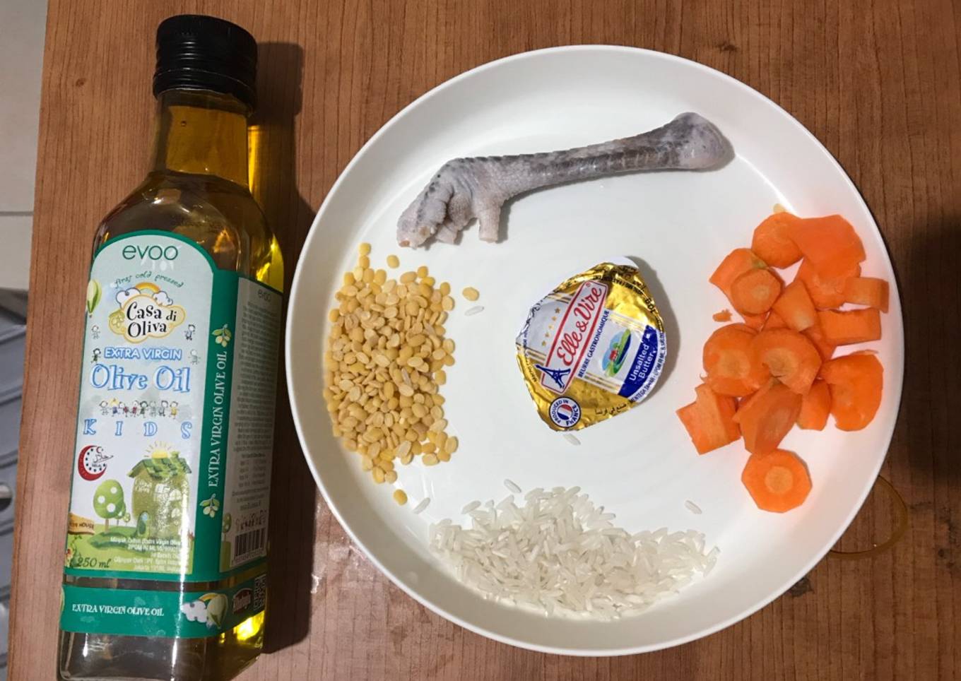 Bahan-bahan dan bumbu yang diperlukan untuk pembuatan Mpasi 7M + Bubur nasi kacang hijau kupas wortel ceker ayam: