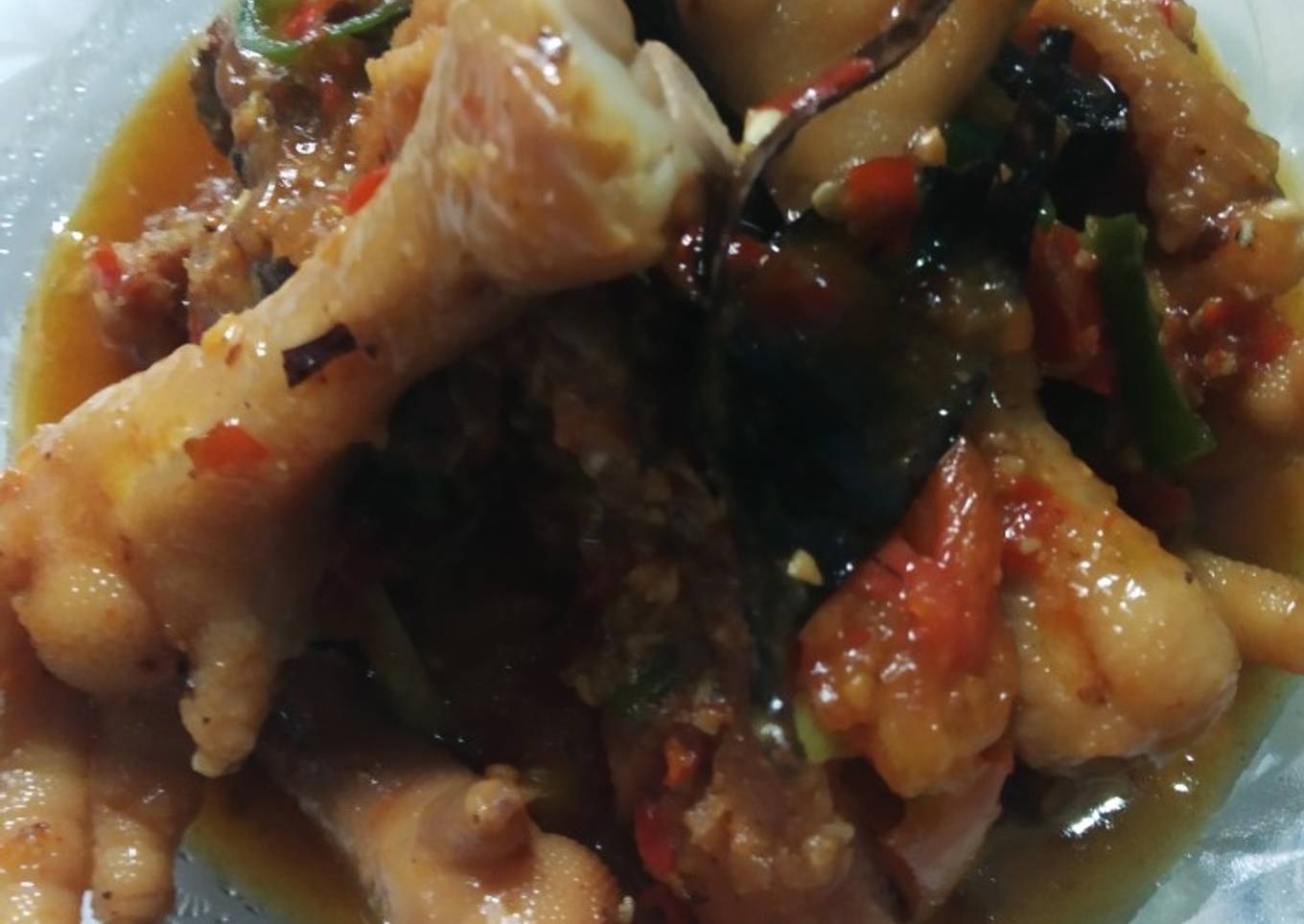 - Masukkan ayam yg telah digoreng dan ceker yg telah di rebus,, biarkan bumbu meresap, lalu angkat dan siap di sajikan.