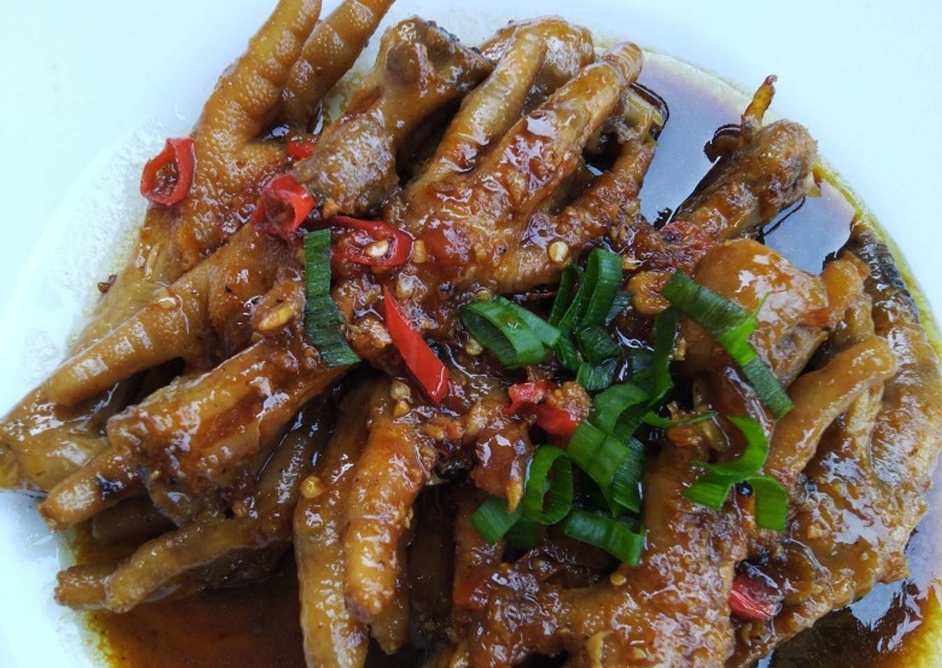 - Masukkan ceker, lalu saos lada hitam, lada bubuk, kecap manis, gula, dan irisan cabe. Tes rasa.