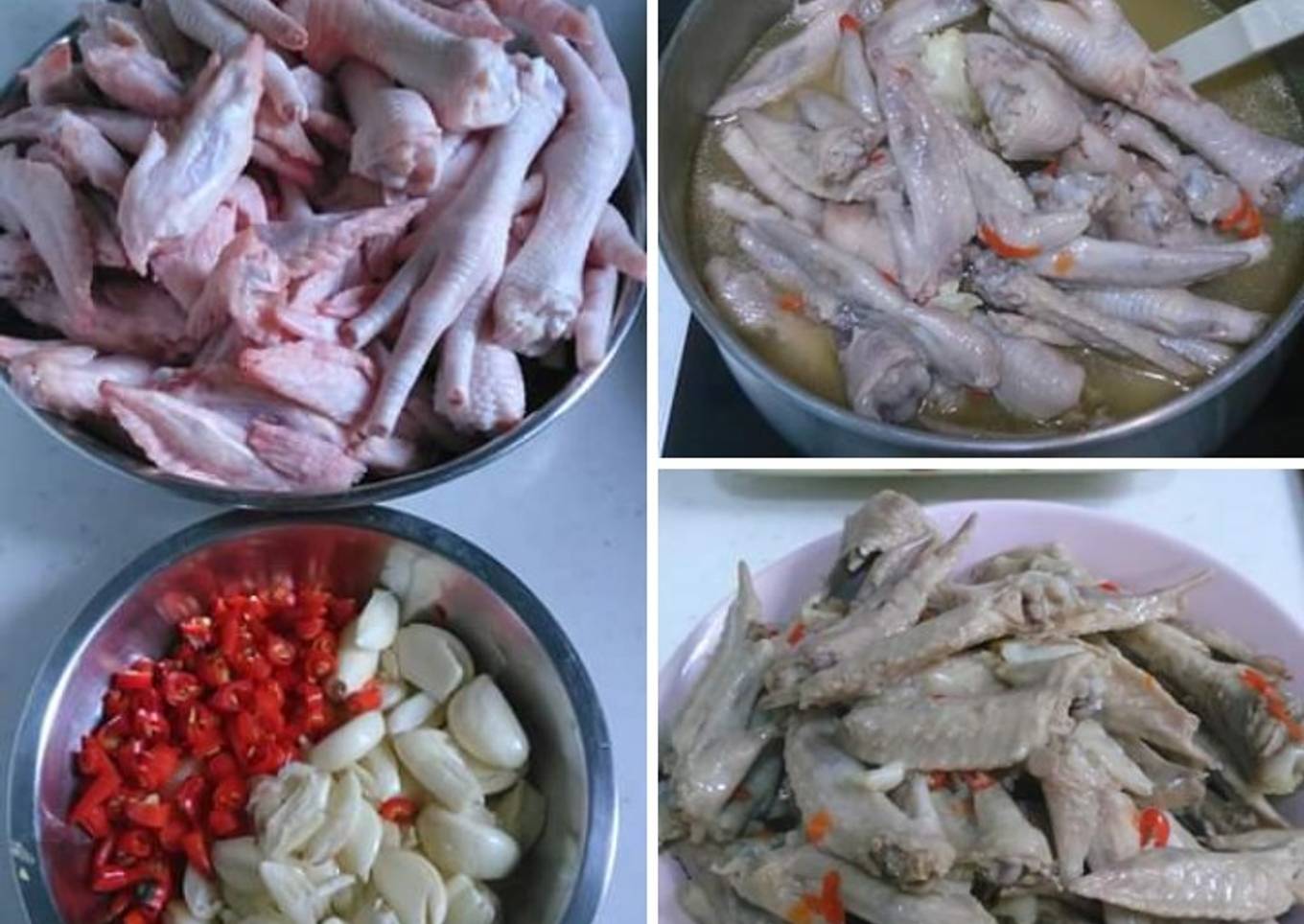 - Siap kan panci dan masak air sampe mendidih masukan ceker dan sayapnya,bawang putih,cabe,garam,masako atau royco secukupnya,gula,tutup masak sampe bahan benar benar empuk,kira kira satu jam dengan api sedang