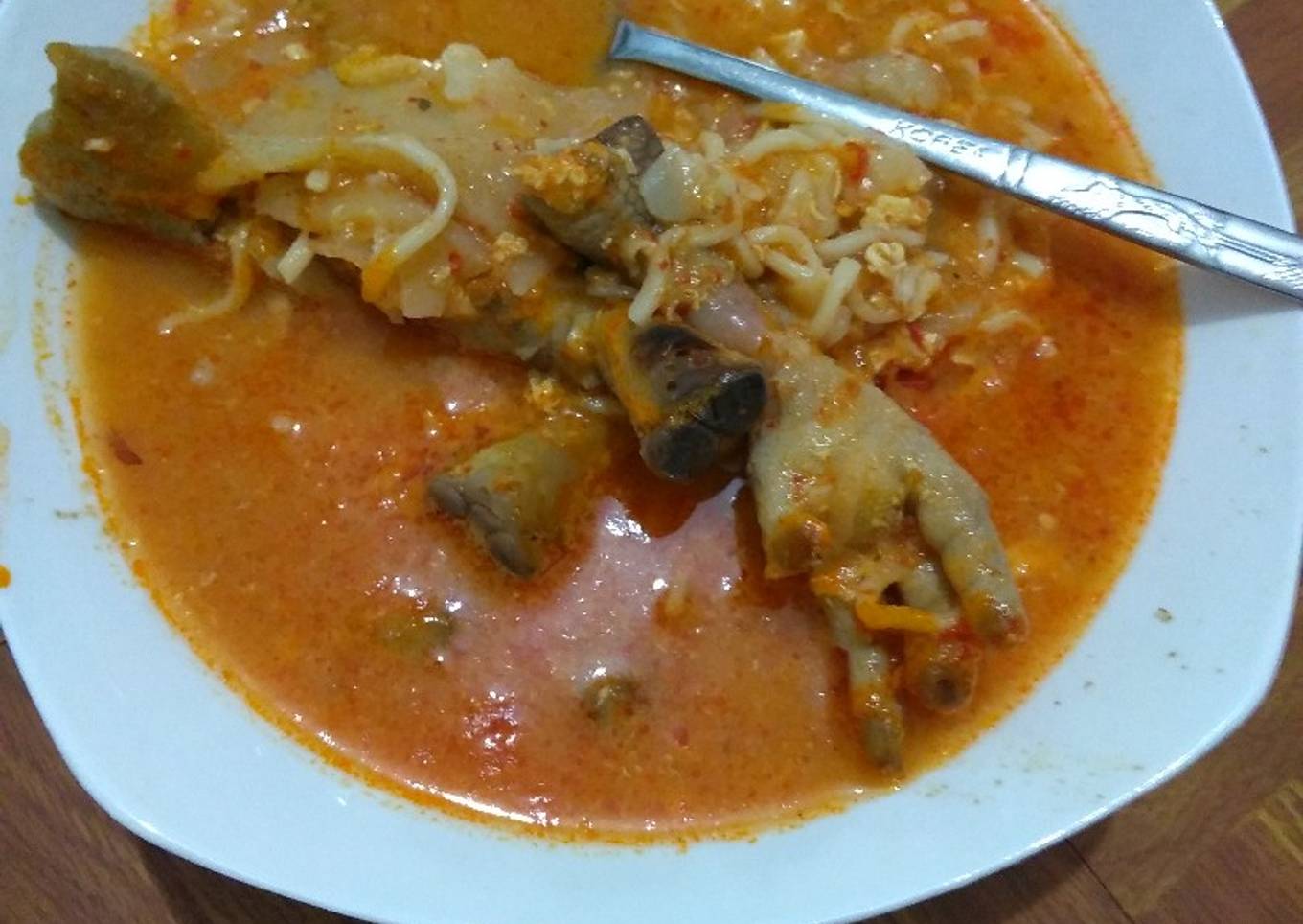 - Masukkan krupuk dan ceker, masak dg api sedang sampai kerupuk bertekstur lmbek, masukkan mie instan, beri garam, kaldu bubuk dan ketumbr bubuk. Aduk rata.