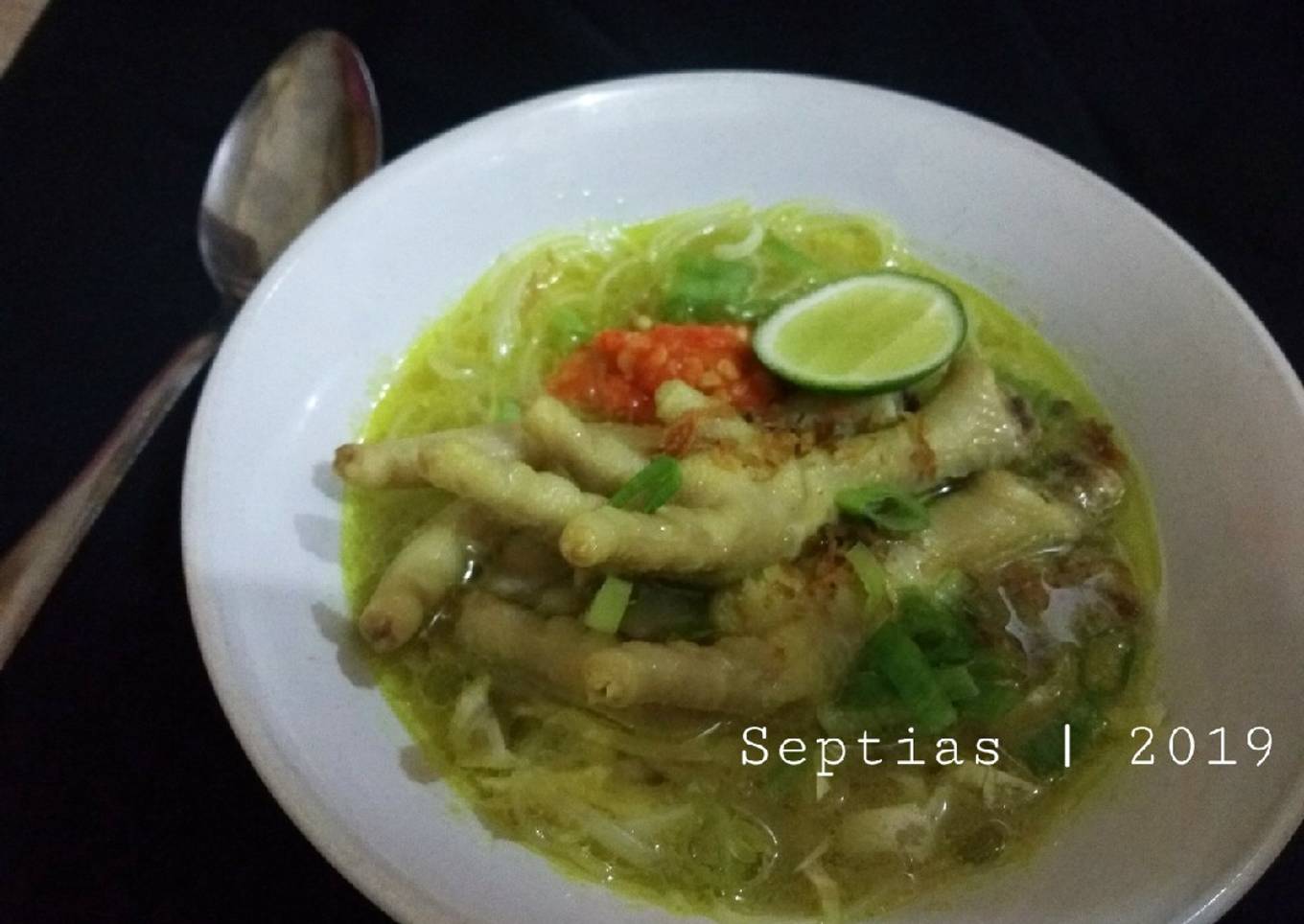 - Penyajian : letakkan 1 per 1 bahan pelengkap. Lalu siram dengan kuah soto dan tambahkan ceker. Beri taburan bawang goreng, daun bawang, sambal dan perasan jeruk nipis. Siap disajikan.