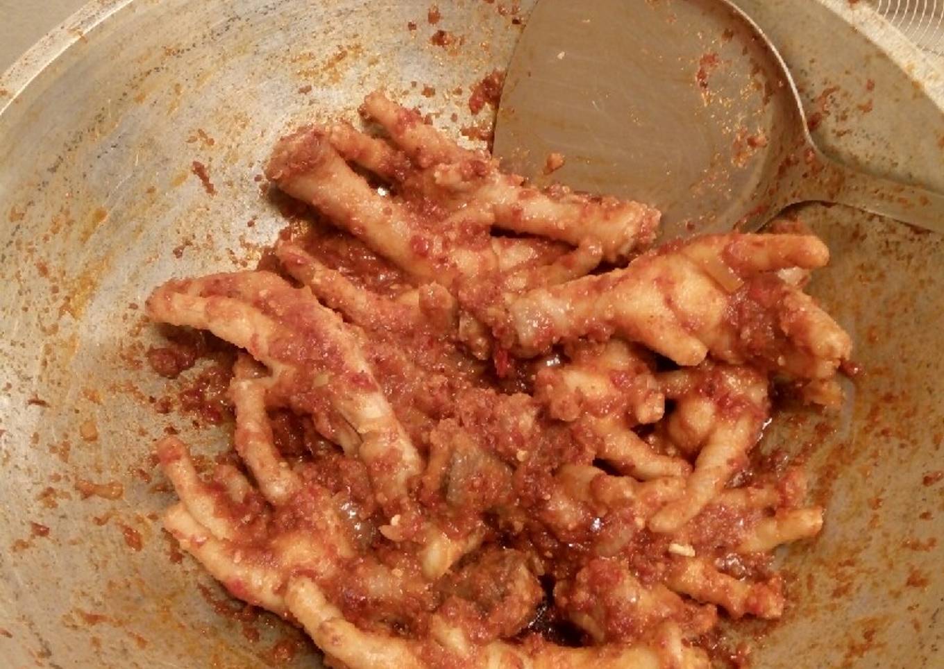 - Tumis bumbu halusnya hingga berubah warna gelap, masukan ceker yang sudah direbus tadi. Aduk hingga rata.