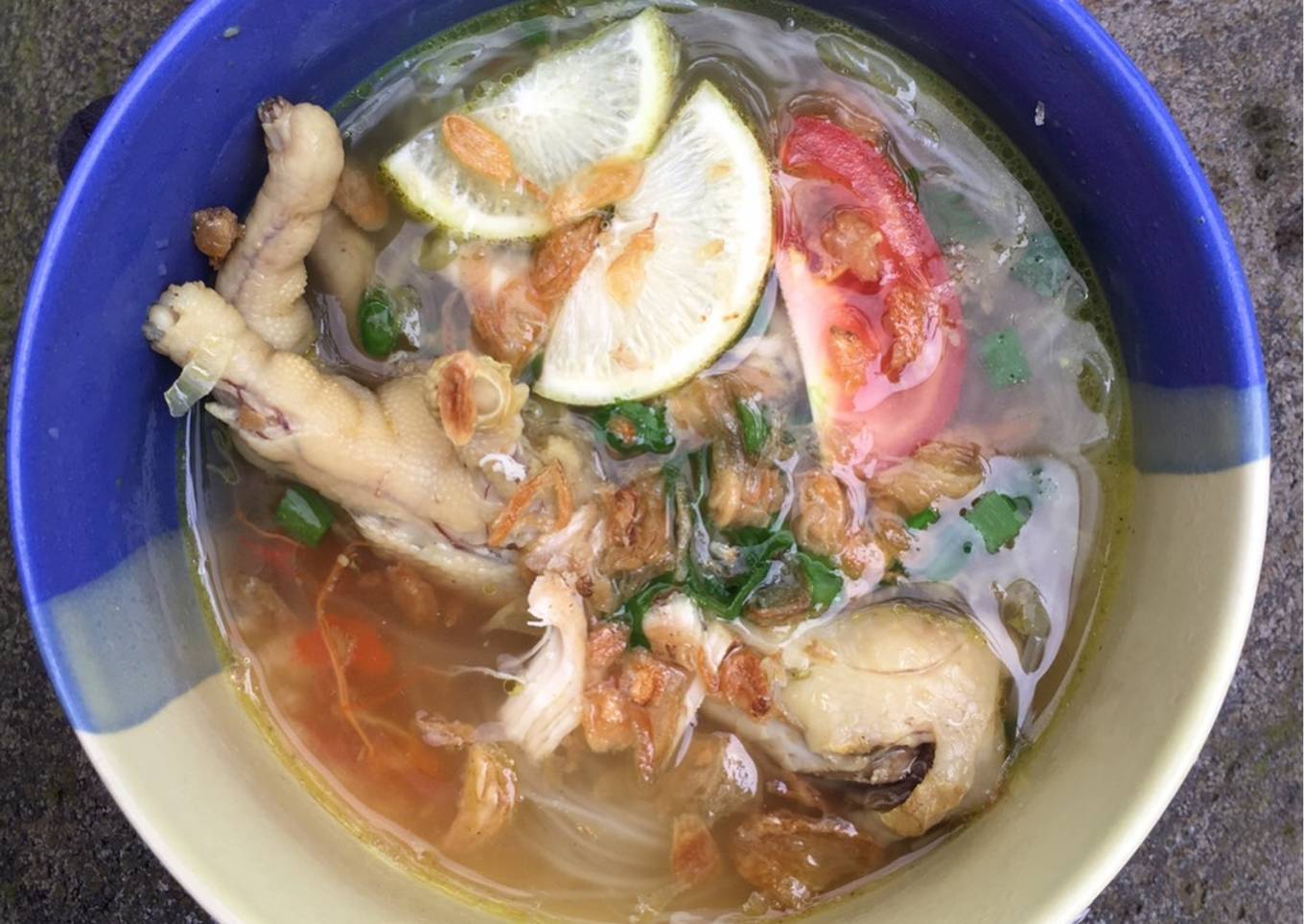 - Siapkan mangkuk, tata mie soun lalu siram dengan kuah kaldu ayam dan beri ceker, suwiran ayam, daun bawang, daun seledri, potongan jeruk dan tomat. Biar makin yummy, beri bawang goreng dan sambel dan siap di santap