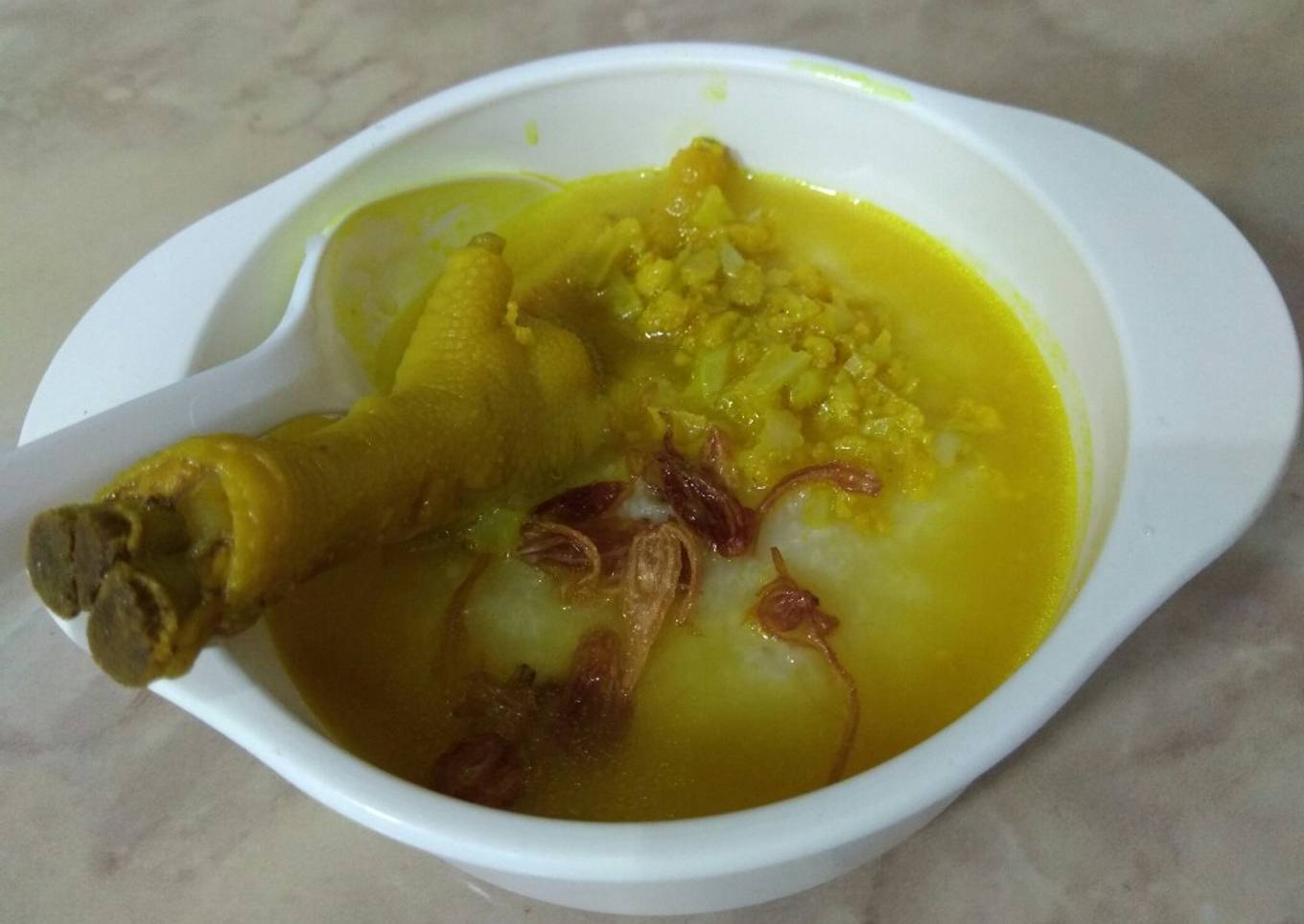 - Penyajian : tuang nasi atau tim pada mangkuk kemudian tambahkan potongan sayur, bawang goreng dan kuah ceker.