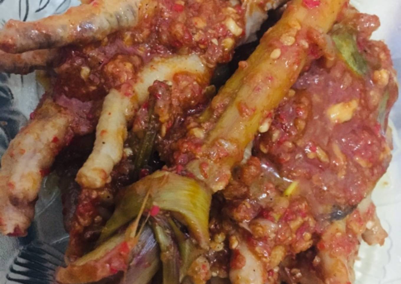 - Cuci bersih ceker dan buang kuku nya, kemudian rebus dalam air mendidih tambahkan daun sereh dan garam secukup nya. Rebus sampai empuk (sekitar 20 menit) tiriskan dan sisihkan.